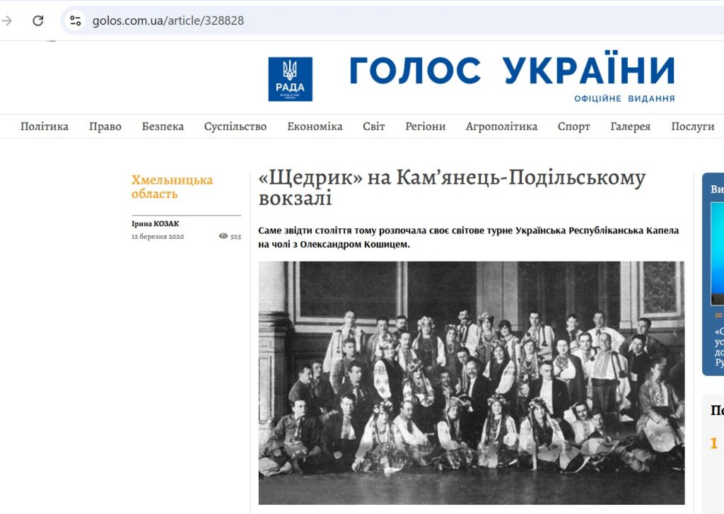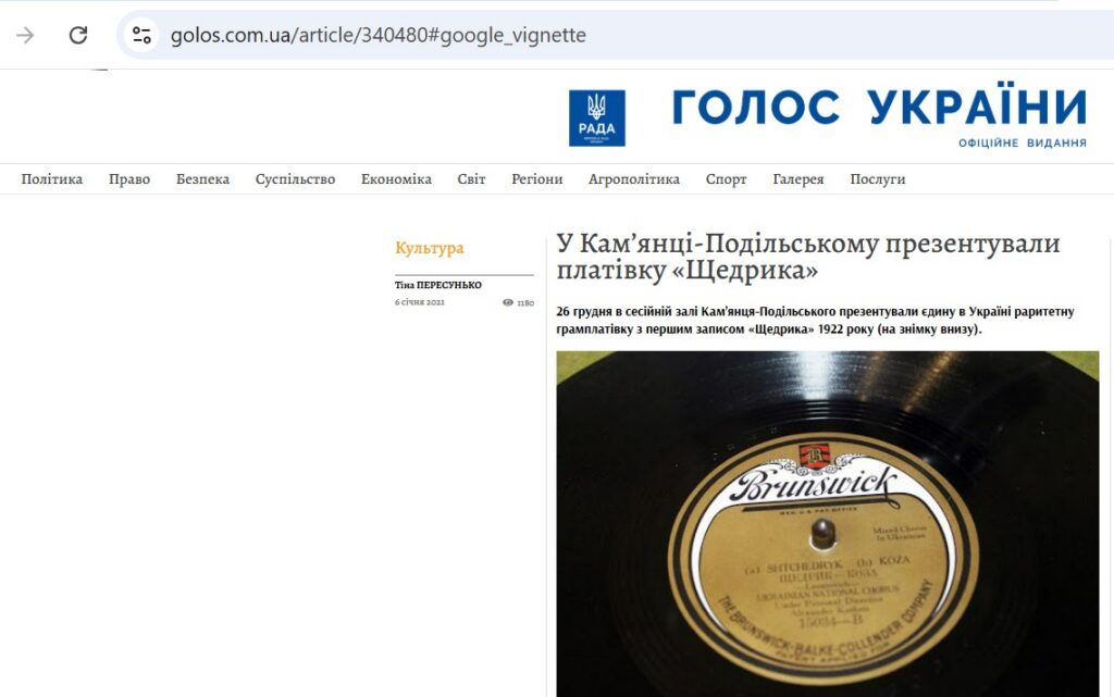 У січня 2021-го у газеті було опубліковано статтю Тіни ПЕРЕСУНЬКО, авторки й кураторки проекту «Світовий тріумф «Щедрика» — 100 років культурної дипломатії України» У Кам’янці-Подільському презентували платівку «Щедрика», яку можна прочитати і на сайті газети.